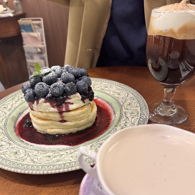 시그니처 메뉴인 블루베리 팬케이크와 밀크티, 아인슈페너.