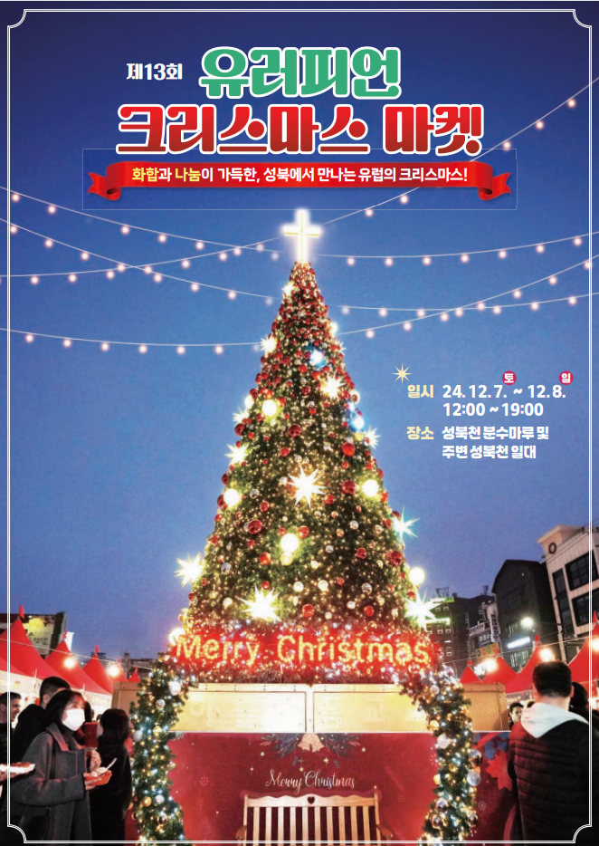 2024년 12월 성북구에서 크리스마스 마켓을 엽니다. 제13회 유러피언 크리스마스 마켓은 13개국 유럽 국가 대사관과 협업하여 내·외국인이 함께 어울려 유럽 각국의 전통과 다양한 크리스마스 문화를 체험하고 즐길 수 있는 글로벌 축제라고 합니다. 유럽의 크리스마스는 굉장히 화려하고 크게 축하하는 기념일 중 하나인데, 한국에서도 유럽 마을의 크리스마스 마켓 특유의 따뜻한 아기자기함과 로맨틱한 낭만을 느낄 수 있는 행사장에서 다양한 장식품, 공예품, 음식 등 여러 국가의 크리스마스 분위기를 한자리에서 체험할 수 있도록 하였습니다. 행사 수익금의 일부는 사회복지공동모금회를 통해 어려운 이웃 및 다문화 가정에 전달될 예정이니 가족, 친구, 연인들과 한 번쯤 방문하여 유럽 마을의 크리스마스 분위기를 즐겨보시는 것은 어떠신가요?